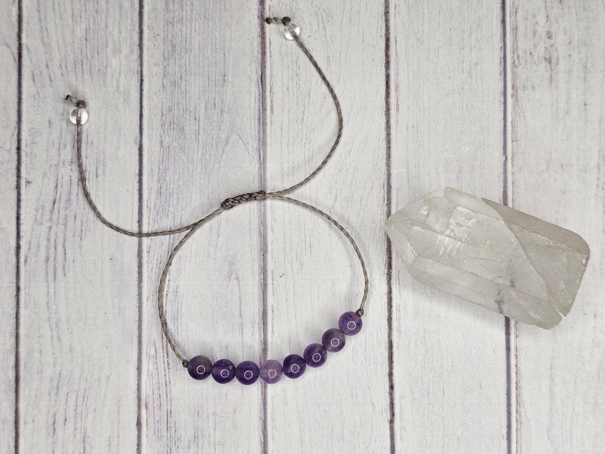 waxed Brazilian cord • Amethyst round beads 6mm • Clear Quartz beads (4mm) • sliding knot closure